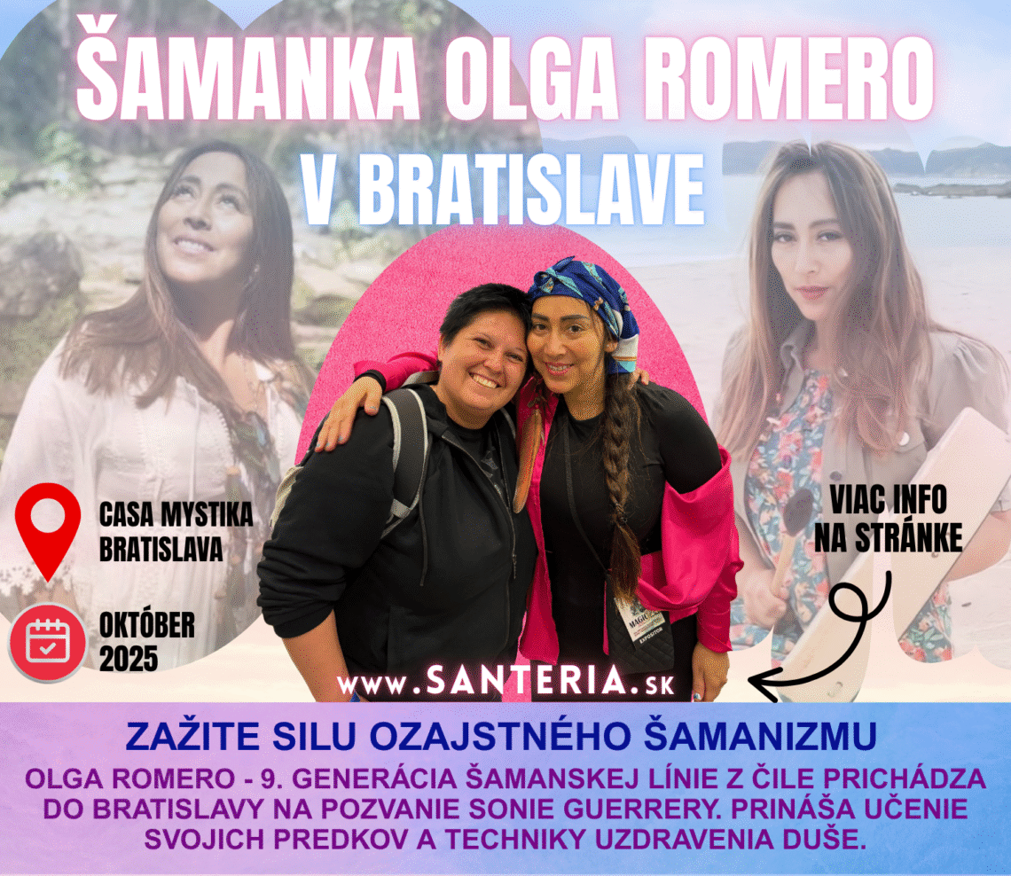 Spoznaj tajomstvá života a zaži na vlastnej koži silu ozajstného šamanizmu. Šamanka Olga Romero prináša znalosti 8-ich generácií šamanov svojho rodu. „Vesmír a Zem čakajú, kým si uvedomíš, že si spojením medzi nimi dvoma.“ SEMINÁR KOZMICKÝ ŠAMANIZMUS 11.10. Základný kurz ,,Chamanismo Cosmico I.“ (200 Eur) 12.10. Pokročilejší kuz ,,Chamanismo Cosmico II.“ (200 Eur) Šamanské terapie, liečenia a konštalácie (150 Eur) Uzdravte svoju dušu a preneste zdravie do svojho tela a blahobyt a harmóniu do vášho života. Nech už je pôvod Vášho trápenia vo Vašej mysli alebo hlbšie vo Vašom rode, šamanka Olga Romero bude pripravená vám pomôcť zbaviť sa akejkoľvek ťarchy. (60 minút) Šamanské…